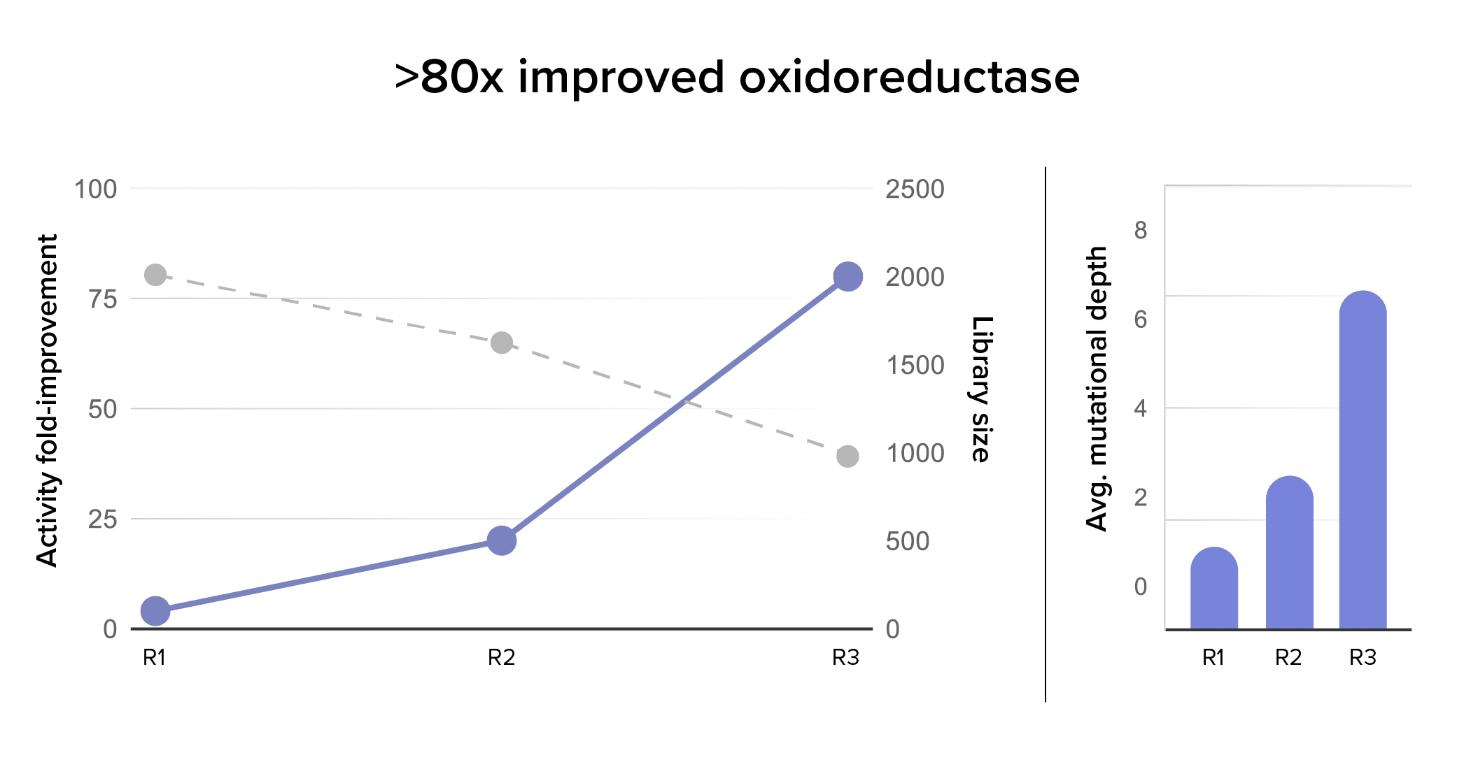 Finally, we optimized the starting sequence towards commercial performance. Zero-shot ML-guided design tools combining sequence- and structure-based modeling enable the design of initial libraries exploring a wide parameter space. Subsequent libraries continue to use these techniques, now augmented by the data from all previous rounds, to recombine observed mutations and identify new ones. This led to order-of-magnitude improvements in each of two difficult phenotypes in only three rounds of engineering.