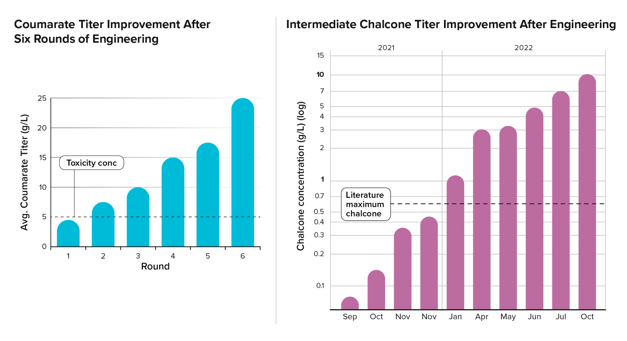 The first program highlights significant progress toward producing a target molecule in yeast for the first time publicly reported. Through iterative rounds of enzyme discovery and optimization, this program yielded a chassis strain with high flux through coumarate, a key bottleneck along the path to the target molecule and variety of other aromatic molecules.