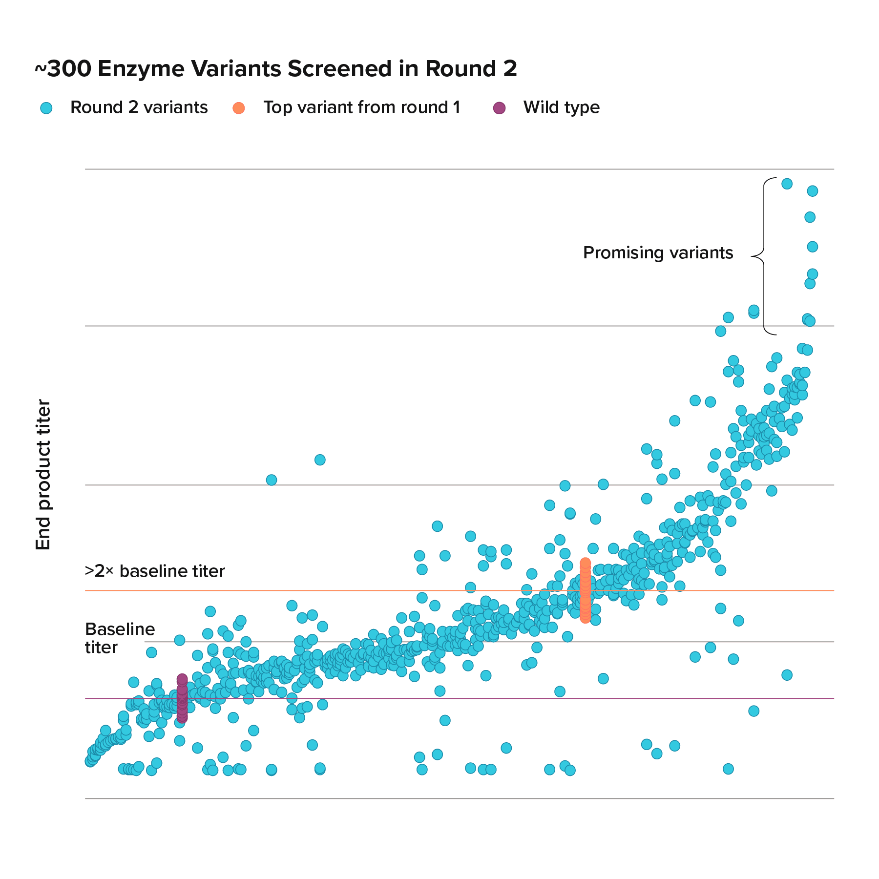 Leveraging this prior work – the “coumarate chassis strain” – a second program for a partner involved in the production of food ingredients had an advanced starting point. Their target is a different set of aromatic molecules produced in yeast downstream of coumarate.