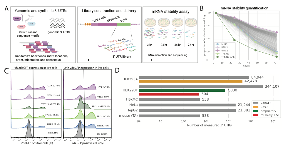 This approach allowed us to curate an extensive dataset of 180,000 unique 3’ UTR sequences and their corresponding stability measurements. Additionally, we collected a much larger dataset that measured mRNA stability of these 3’ UTRs in different cellular contexts and with different coding sequences. To our knowledge, this MPRA dataset represents the largest existing dataset relating mRNA stability to synthetic 3’UTRs – an extraordinary resource for machine learning applications.