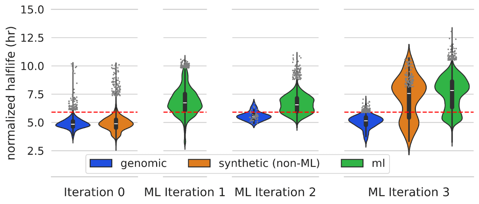 We combined our supervised model trained on stability data with various design algorithms and generative models to design novel 3’ UTRs. We ran three iterations of machine learning-driven design, and found that multiple rounds of machine learning-driven design led to significant increases in mRNA stability compared to sequences used to train our initial model. ML designs significantly outperformed a set of genomic 3’ UTRs as well as synthetic 3’ UTRs that were designed by a human.