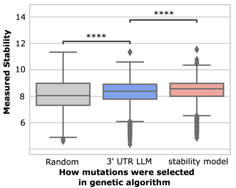 Surprisingly, we found that even though the LLM was not trained on stability measurements (only sequence), using the LLM to select the most likely mutations resulted in sequences with higher measured stability than randomly selected mutations. Our 3’ UTR LLM is available at https://models.ginkgobioworks.ai/models.