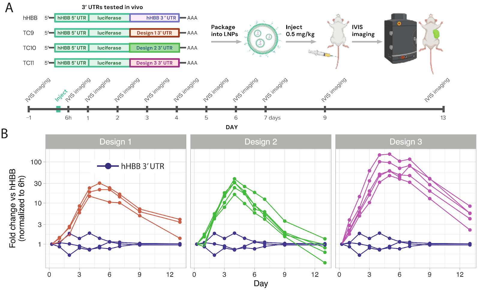 We validated designs in an in vivo mouse model, which demonstrated mRNAs that produced up to twice the protein payload over their lifetime and 30-100x more activity at the one week time point.